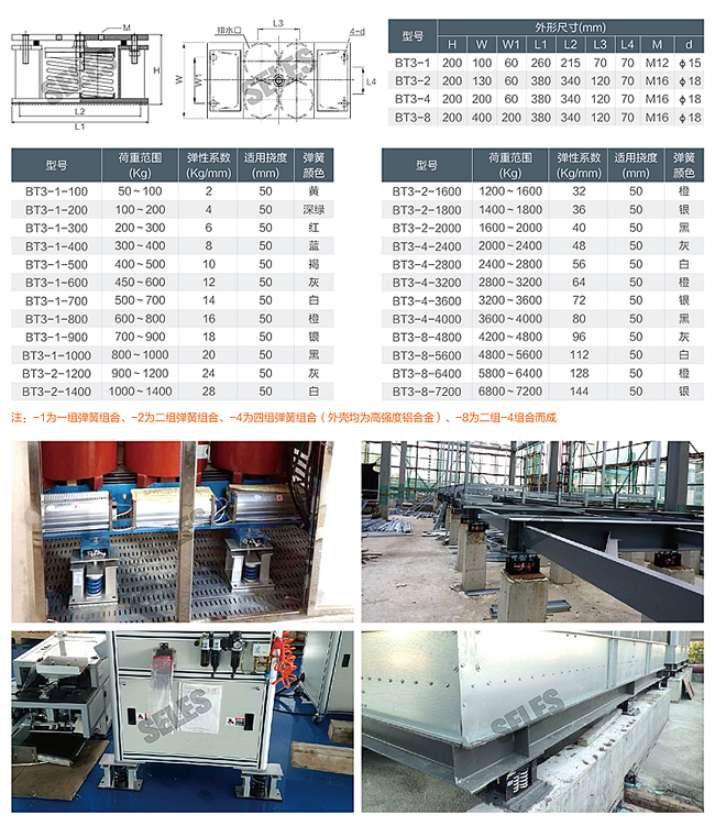 BT3型彈簧減振器撓度50mm,在額定載荷下固有頻率2.2Hz,阻尼比為0.05,工廠已對彈簧預(yù)緊壓縮60%,易于調(diào)節(jié),是積極、消極減振的理想產(chǎn)品。