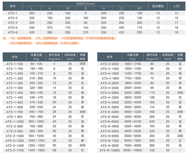 AT3型彈簧減振器撓度25mm,在額定載荷下固有頻率3.2Hz,阻尼比為0.03,是積極、消極減振的理想產(chǎn)品。